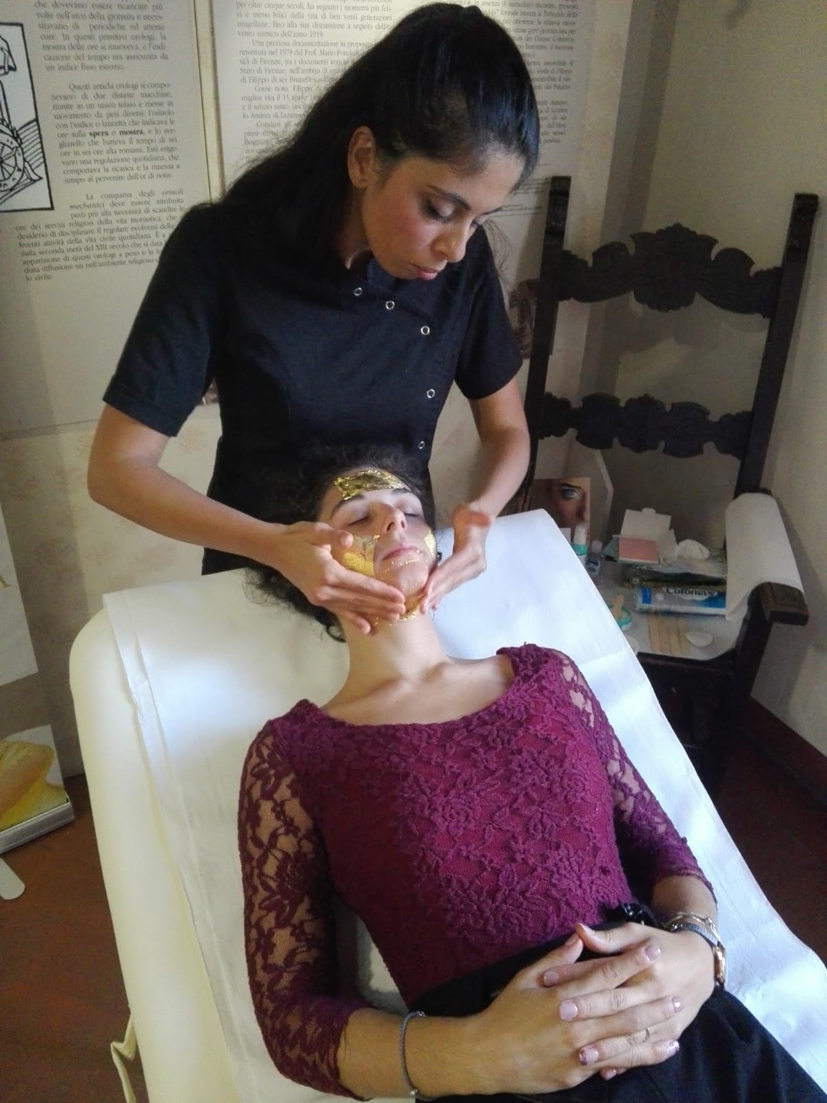 Abbiamo avuto l'opportunità di provare un particolare trattamento della linea Beauty Gold il cui prodotto di punta è rappresentato dalla foglia oro 24 Kt. Essendo questo un oro puro, ha effetti benefici per la pelle e oltre ad avere effetto occlusivo (per cui la crema messa come base non evapora e tende quindi ad assorbirsi al 100%), dà nel tempo anche un effetto luminoso e anti age.